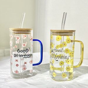 Borosilicate Square Glass Matcha Cups with Lids and Glass Straws 400-ml #K-101