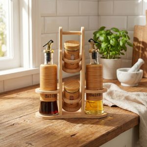 Bamboo 4-Pcs Spice Rack Set Glass Oil Bottle & Glass Pepper and Salt jars Plastic Lid #CB-TWJ41