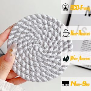 6-PCS Round Handmade woven Cotton Coasters with Storage Basket 10cm – Grey/White
