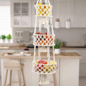 3-Tier Bohemian Macrame Hanging Basket, Handmade Fruit Basket, Cotton Rope Plant Holder for Kitchen Organizer